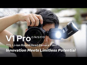Il V1Pro è alimentato da una batteria ricaricabile, che assicura un'autonomia di almeno 500 lampi a piena potenza, ideale per lunghe sessioni fotografiche senza interruzioni. Il display LCD facilita la navigazione tra le impostazioni e la regolazione dei parametri.